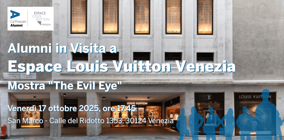 Ci accoglierà Denise Da Lio, coordinatrice dell'Espace veneziano. Alumna Cafoscarina, corso di laurea sia triennale che magistrale in EGART, svolge dei primi lavori nell’arte con uno stage al Guggenheim, poi al padiglione USA alla Biennale. Ha partecipato al corso di Arti curatoriali della Galleria A+A di Venezia e i corsi di Registrar e Logistica delle opere d’arte di Palazzo Spinelli a Firenze, dal 2014 dopo uno stage in Espace è rimasta in Louis Vuitton e fino al 2024 era la referente per le categorie prodotto dei bauli e della collezione di oggetti d’arredo Objets Nomades. Innamorata di Venezia e amante del bello in tutte le sue forme.