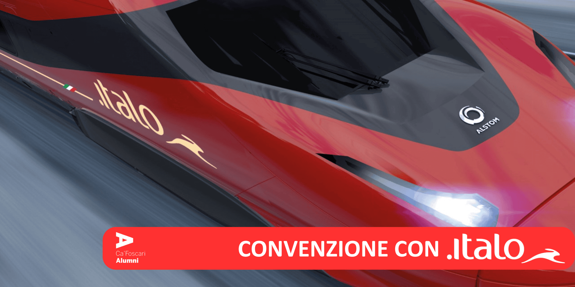 Grazie alla convenzione attiva con Italo, tutti gli Alumni dell'Università Ca' Foscari Venezia possono usufruire della convenzione per viaggiare con una scontistica del 20% negli ambienti SMART (2^ classe), PRIMA e CLUB EXECUTIVE, inclusi i salotti su tariffe FLEX modificabili e rimborsabili.
