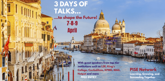 Dal 7 al 9 aprile si terrà "PISE Network – three days of talks to shape the future", un evento in lingua inglese che coinvolgerà relatori ospiti provenienti da istituzioni di alto livello e che è realizzato in collaborazione con Ca' Foscari Alumni, Polis Venezia e JEVE.