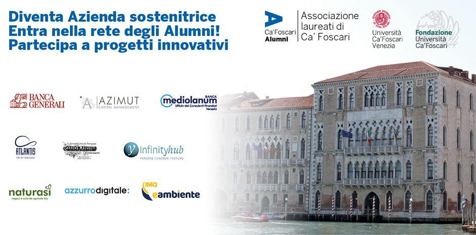 Ca' Foscari Alumni è la rete che valorizza l'identità cafoscarina e funge da catalizzatore per nuovi progetti, attingendo dalle competenze e relazioni dei tantissimi laureati passati per il nostro Ateneo. Ponendosi nel solco di una lunga tradizione, l'Associazione conta migliaia di Soci sparsi in 85 paesi del mondo e più di 50.000 contatti di Cafoscarini. Si può aderire a Ca' Foscari Alumni come Azienda Sostenitrice per 1 o 3 anni, così da partecipare a tutte le iniziative promosse, oppure come Sostenitore di progetto per intervenire su specifiche attività.